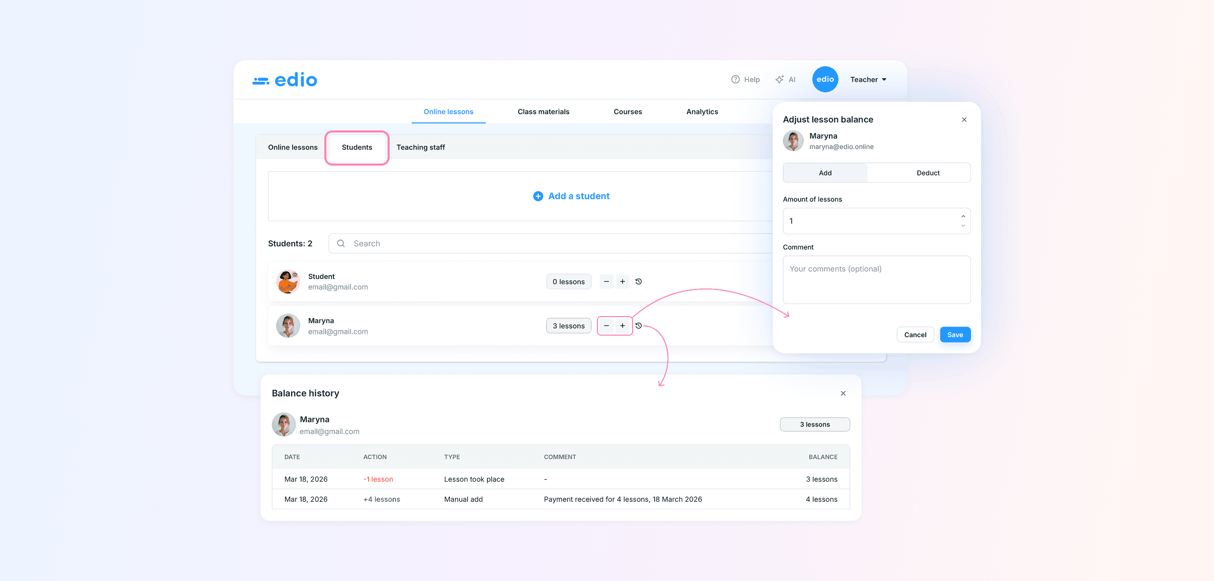 Paid lesson balance