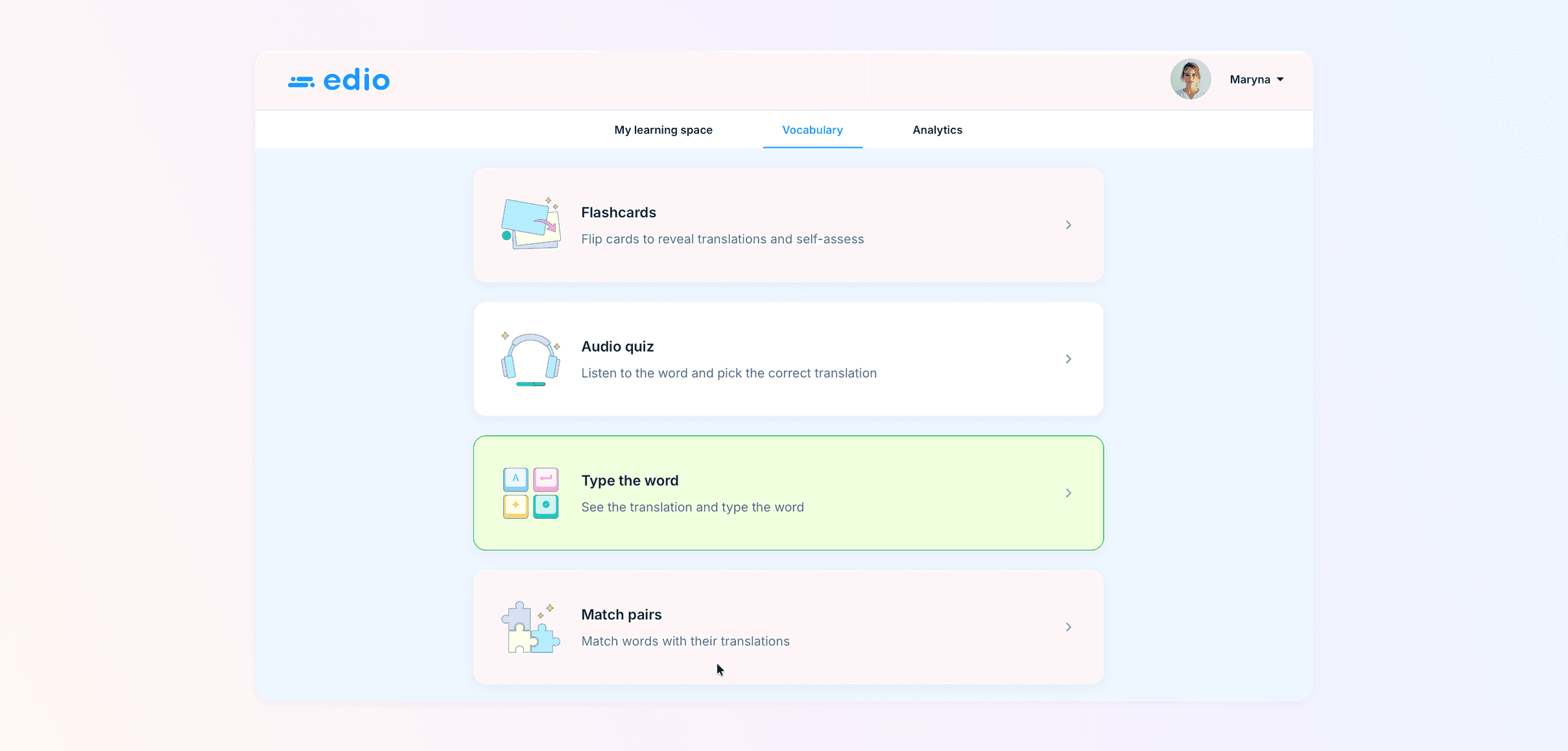 Now, students can not only collect words during lessons but also practice them directly in their account, turning passive vocabulary into active knowledge.